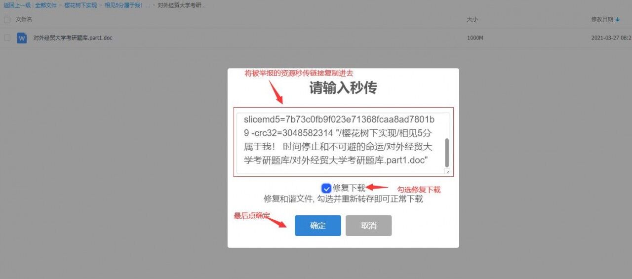 将被举报无法下载百度秒传文件代码链接复制进去,并勾选【修复下载】,再点【确定】如下图