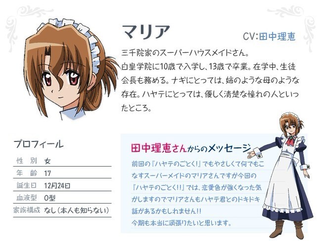 17岁,生日是12月24日(因为于圣诞夜在圣母玛利亚像下被捡到,所以命名为玛莉亚,登记生日为12月24日),血型是O型身高是161cm,体重是45kg。